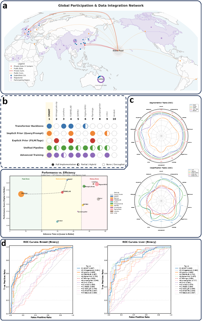 Figure 2. (a) Global Participation & Data Integration Network spanning five continents. (b) Methodological Configuration Matrix summarizing architectural choices for the top-10 teams. (c) Multi-Organ Diagnostic Versatility and Efficiency Pane showing segmentation (DSC) and classification (AUC) performance across anatomical regions. The winning model (SMART) demonstrates consistent coverage across tasks. (d) Diagnostic Precision (ROC Curves) for Breast Malignancy and Fatty Liver tasks on the private test set.